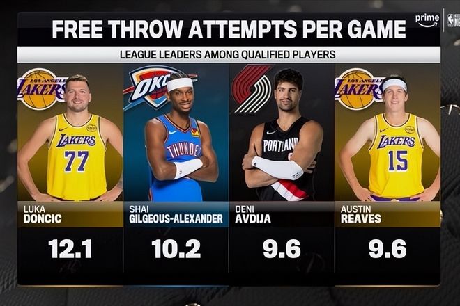 北京时间12月11日,NBA杯真正进行,在太阳对阵雷霆的比赛中,前方转播平台列出了本赛季走上罚球线次数前四名的球员,很多人好奇,前10名都是谁,那么下面咱们逐一来看看。本赛季罚球前10出炉:哈登第5,湖人两人上榜,勇士核心得分最低。